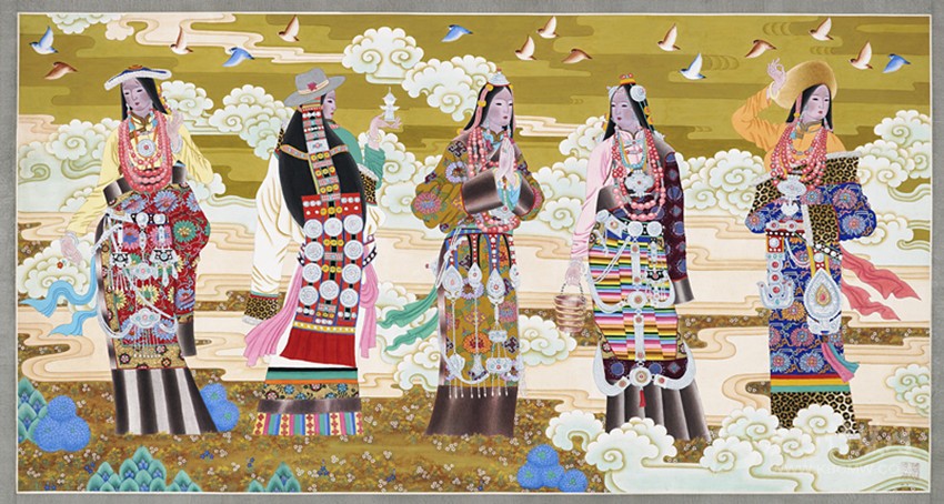 青藏高原有著曠遠弘大的人文地理,有著神秘久遠的宗教文化傳承,正是這蒼茫大地孕育了藏族人;正是這片極度追求審美體驗并把生活高度藝術(shù)化的疆域,滋養(yǎng)了西藏藝術(shù)。從早期的巖畫、旗幡畫、唐卡、壁畫,再到當代的丹青重彩,無不生發(fā)于這片神奇高原,皆是中華民族文化寶庫中燦爛的牟尼寶珠。唐卡繪畫肇啟于松贊干布隆興之時,向南學習印度、尼泊爾布畫,往西受到犍陀羅藝術(shù)浸潤,向東融合唐、宋、明、清之審美,再集藏地宗教文化、民族審美熔為一爐,鑄就一千三百年唐卡繪畫之法脈。它不僅是獨具魅力的藏文化之血脈源流,更是各民族文化交融、和諧互生的典范,對世界藝術(shù)有著深遠的影響。