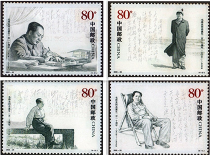 2003年12月6日, 中國郵政發(fā)行《毛澤東同志誕生一百一十周年》紀念郵票一套4枚,分別表現(xiàn)了毛澤東在西柏坡、毛澤東在北戴河、毛澤東在廬山、毛澤東在廣州的不同形象,背景以相應的毛澤東詩詞書法襯托,偉人的豐姿躍然票上。這套以照片為基礎采用膠雕套印大票面黑白兩色的郵票,樸素大方,典雅大氣。郵票中的人物形象從面部表情到坐立姿態(tài),都顯出神采奕奕、栩栩如生。