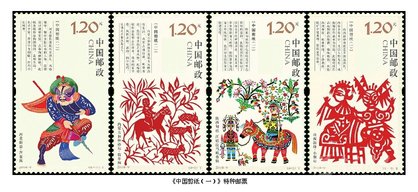 2018年1月24日,中國郵政發(fā)行《中國剪紙(第一組)》特種郵票,全套4枚。這是中國郵政繼1959年1月1日發(fā)行的《剪紙》特種郵票59年后重新發(fā)行的《中國剪紙》系列郵票。全系列郵票計劃發(fā)行4組,每組4枚。這次發(fā)行的第一組4枚郵票入選內容分別是被列入第一批國家級非物質文化遺產名錄的北方四處剪紙傳承人的作品:第一枚“河北蔚縣·蘆花蕩”,河北蔚縣剪紙歷史悠久,風格獨特,題材多取自于人物,造型設計疏密有致,點染絢麗鮮艷。此幅作品作者王老賞(1890-1951),河北省蔚縣南張莊村人;第二枚“內蒙和林格爾·牧羊圖”,內蒙古和林格爾剪紙多反映游牧生活,具有古拙浪漫、質樸奔放、熱情率真的藝術風格。此幅作品作者張花女 (1903-2004),和林格爾縣董家營鄉(xiāng)曹老八夭村人;第三枚“陜西旬邑·江娃拉馬梅香騎”,陜西旬邑的彩色剪紙具有民間美術的鮮活靈動,無拘無束,形象稚拙而又鮮明,構圖緊密完滿而又單純明快,色彩對比強烈而又協(xié)調適度。此幅作品作者庫淑蘭(1920-2004),陜西咸陽市旬邑縣張洪鎮(zhèn)赤道鄉(xiāng)富村人;第四枚“山西新絳·小別母”,山西新絳剪紙藝術源遠流長,內容豐富多彩,尤以人物見長,戲曲題材作品更為突出,構圖簡潔飽滿、精煉極致,粗獷中見典雅,簡煉而不簡單。此幅作品作者蘇蘭花(1906-1995),山西運城市新絳縣澤掌鎮(zhèn)北蘇村人。