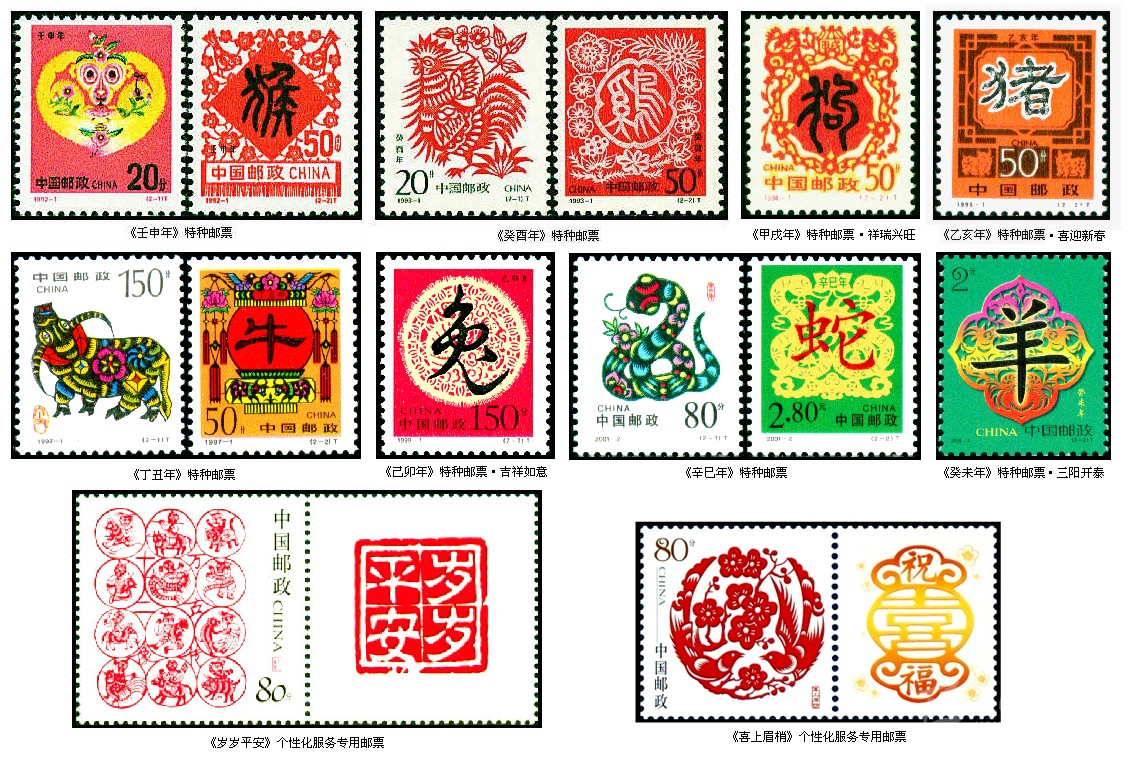 剪紙作為藝術百花園中的一朵奇葩,在我國郵票圖案設計中應用也非常廣泛。由于傳統(tǒng)的民間剪紙有著濃郁的吉祥喜慶氣氛,因此在我國近些年發(fā)行的生肖郵票中多次出現剪紙藝術。在第二輪12套24枚生肖郵票中的剪紙圖案分別有1992年《壬申年》的“猴桃獻瑞”和“喜鵲登梅”、1993年《癸酉年》的“雄雞報曉”和“四季吉祥”、1994年《甲戌年》的第二枚“祥瑞興旺”、1995年的《乙亥年》的第二枚“喜迎新春”、1997年的《丁丑年》的“金牛奮蹄”和“牛耕年豐”、1999年《己卯年》的第二枚“吉祥如意”、 2001年《辛巳年》的“祥蛇祝?!焙汀跋檫\普照”以及2003年的《癸未年》第二枚“三陽開泰”等。這些郵票中剪紙圖案有的直接取材于民間,有的則是在原作基礎上再創(chuàng)作。如“雄雞報曉”一枚,圖案選用的是河北省獻縣本齋鄉(xiāng)鄧家莊蔡蘭英老人的剪紙“百雞圖”中的一幅,而“金牛奮蹄”一枚,圖案是根據山東高密民間藝人齊秀花的剪紙“媳婦騎牛”再加工創(chuàng)作而成的。在我國發(fā)行的祝福系列個性化服務專用郵票中也有吉祥喜慶的剪紙圖案,即2005年11月6日的《歲歲平安》和2005年11月11日的《喜上眉梢》等。