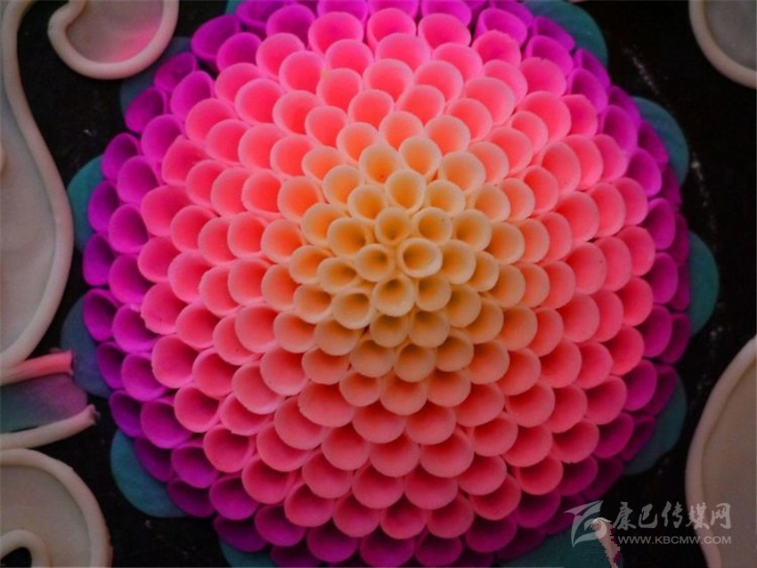 創(chuàng)作酥油花的工序是復(fù)雜、細(xì)致的:首先是確定油塑的題材,塑什么花,必須報(bào)請(qǐng)寺主審查通過;其次是揉和酥油,將各種顏料與酥油調(diào)和成彩色酥油;接下來是塑造基本模型,并按草圖扎制花架,涂塑鮮花的形體,將花朵、花葉、花莖安裝到花架上;最后,用金彩粉對(duì)整個(gè)酥油花進(jìn)行勾勒和裝飾……酥油花終于宣告塑成。