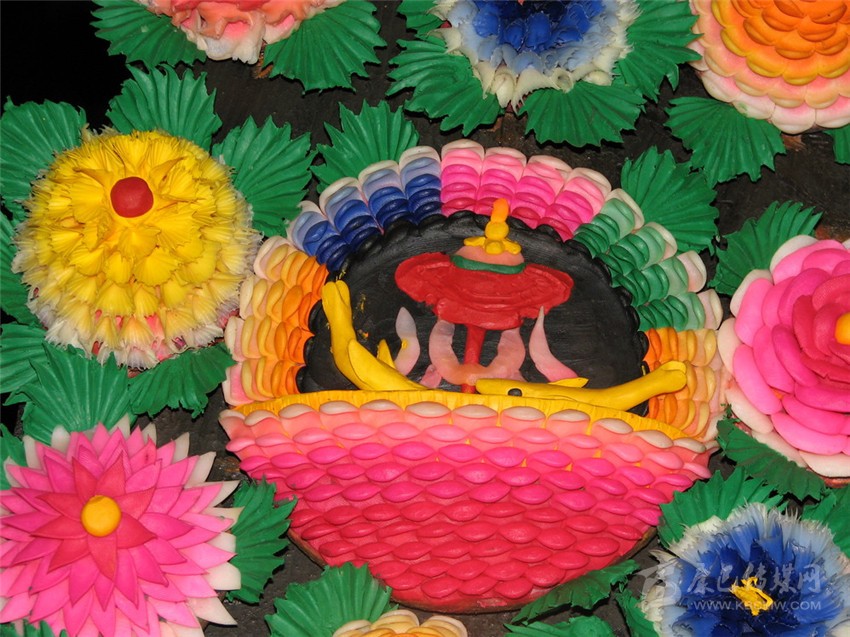 酥油花酥油花雖名曰“花”,但其題材多樣,內(nèi)容豐富,主要以佛祖神仙、菩薩金剛、飛禽走獸、花鳥魚蟲、山林樹木、花卉盆景組成各種故事情節(jié),形成完整的立體畫面。它的造型特點(diǎn)和手法類似國外盛行的臘像藝術(shù),但不宜長期保存。酥油花藝術(shù)繼承藏傳佛教藝術(shù)的精、繁、巧的特點(diǎn),在一個(gè)有限的空間中容納極多的內(nèi)容。大至一米到二米,小至十到二十毫米的人物走獸,個(gè)個(gè)精到,力求寫實(shí),而其姿態(tài)神韻力求傳神達(dá)意。在畫面布局上則繼承佛教壁畫中“異時(shí)同地”的處理方法,在同一畫面中將一個(gè)完整的故事內(nèi)容同時(shí)塑造出來。如大型酥油花《釋迦牟尼本生故事》。 酥油花的制作必須在冬季低溫下進(jìn)行,因而塔爾寺酥油花都在每年農(nóng)歷正月十五日塔爾寺燈節(jié)展出,屆時(shí)來自西藏、內(nèi)蒙古,四川等地的農(nóng)牧民及海內(nèi)外游人云集山之中,山上山下,寺宇周圍,入山人海,為一睹晶瑩剔透的酥油花。