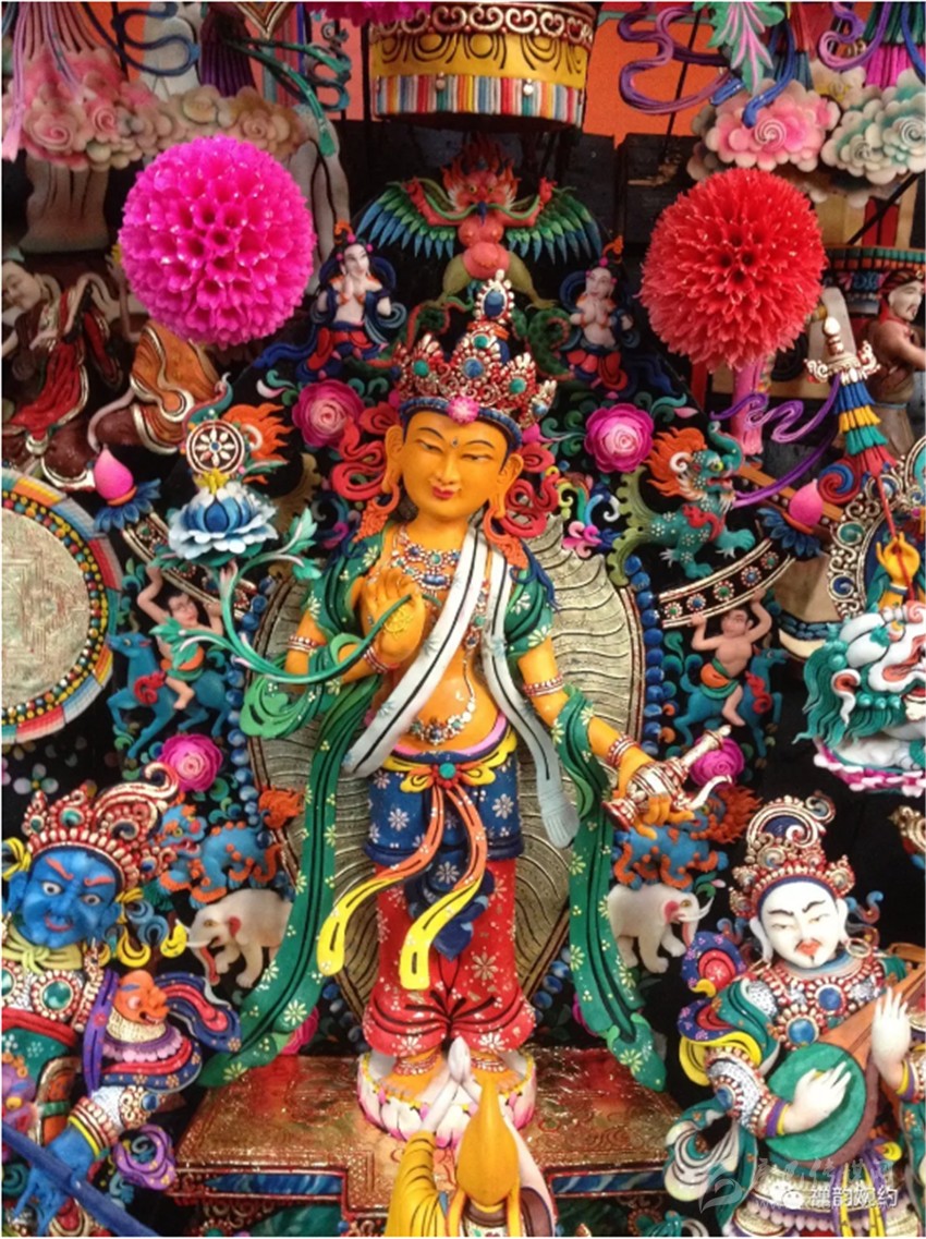 有傳說稱641年文成公主進(jìn)藏,帶去一尊釋迦牟尼12歲等身像并將其供奉于拉薩的大昭寺,當(dāng)?shù)厝罕娪盟钟妥龀苫ü┇I(xiàn)于佛前,以示崇敬之心,后各藏傳佛教寺院相繼使用,視為禮佛珍品,獻(xiàn)酥油花遂成為正月祈愿大法會(huì)的重要內(nèi)容。在發(fā)展過程中,酥油花的塑造方式、花色品種、內(nèi)容題材和工藝技巧都不斷發(fā)生著變化。
