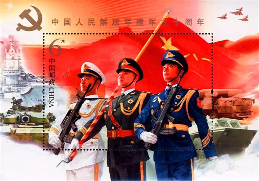 2017年8月1日,中國郵政發(fā)行《中國人民解放軍建軍九十周年》紀(jì)念郵票小型張“聽黨指揮”(圖8)。郵票畫面上“八一”軍旗飄揚(yáng),各軍種英姿颯爽,背景襯托各軍種高尖端裝備,描繪了我軍戰(zhàn)士聯(lián)合作戰(zhàn)的畫面,既表現(xiàn)了中國人民解放軍威武雄壯的軍容和現(xiàn)代化水平,也表現(xiàn)了在黨的指揮下,人民軍隊(duì)忠實(shí)履行保衛(wèi)祖國、捍衛(wèi)和平的神圣使命。