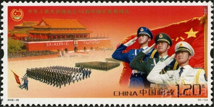 2009年10月1日,中國郵政發(fā)行的《中華人民共和國成立60周年國慶首都閱兵》紀(jì)念郵票一套4枚。其中第1枚“徒步方隊(duì)”(圖6),圖案為中國人民解放軍三軍儀仗隊(duì)執(zhí)旗手和護(hù)旗手在軍旗下行軍禮。