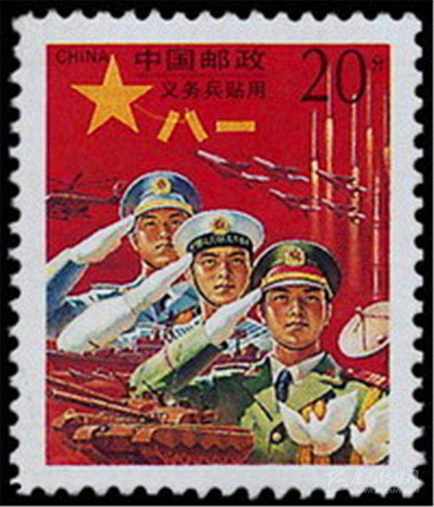 1995年8月1日,原郵電部試發(fā)行一套“義務(wù)兵專用”郵票一套1枚(圖5),票名為“神圣的使命”,圖案以紅光四射的“八一”軍旗為背景,以現(xiàn)代化的飛機(jī)、坦克、火箭和象征和平的白鴿為襯托,畫面是威武的陸??杖?,顯示我軍鋼鐵長城般功無不克、戰(zhàn)無不勝的精神風(fēng)貌。