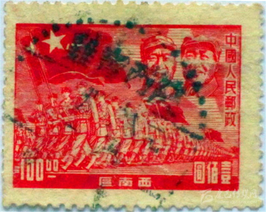 我國最早出現(xiàn)“八一軍旗”的郵票,是1949年8月1日, 剛解放的上海華東人民郵政發(fā)行的《中國人民解放軍建軍22周年》俗稱《華東進(jìn)軍圖》郵票(圖1),一套5枚,同圖異色異值,郵票右上方為毛澤東主席和朱德總司令頭像,下方是鐵流般的人民軍隊(duì)高舉著一面面“八一軍旗”。 同年12月,西南區(qū)人民郵政又發(fā)行一套11枚圖案相同“西南進(jìn)軍圖”郵票(圖2)。