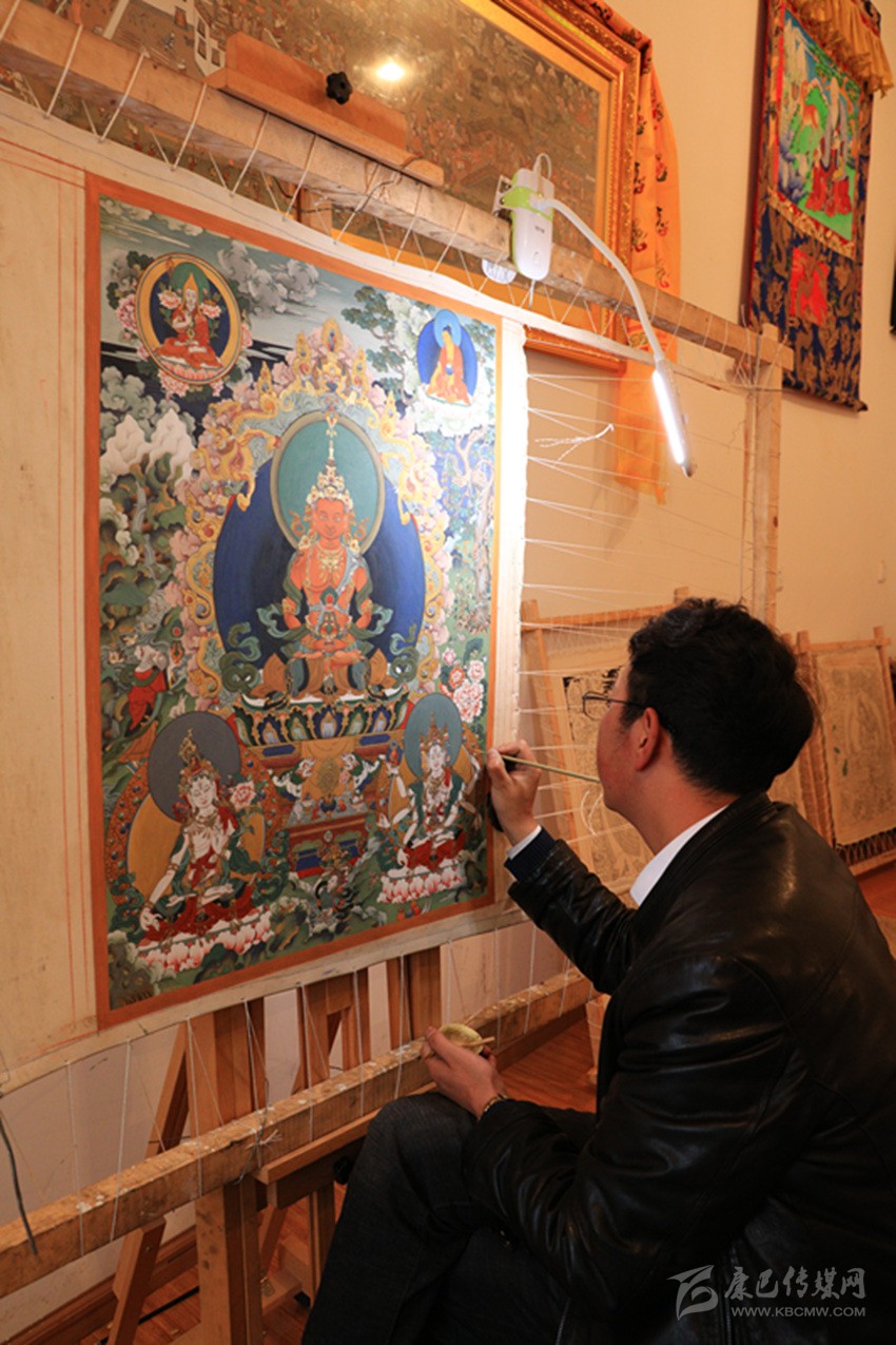 在十多年的繪畫生涯中,著著接觸了很多畫師,經常與他們一起交流,并在不斷的摸索與總結中讓自己的技藝得到不斷提升,為了潛心作畫和讓更多愛好唐卡畫的青年學習唐卡畫,家在農村的著著在城里租房開設了現(xiàn)在的畫室,并招收了徒弟。目前,著著歷時四個月以宗教為題材潛心創(chuàng)作的唐卡畫《釋迦牟尼》,已投送到第二十屆杭州西湖國際博覽會中國民間藝術產業(yè)示范展會上,他想通過參加展會的方式讓更多人了解被列為非物資文化遺產的藏族唐卡畫和藏民族文化。