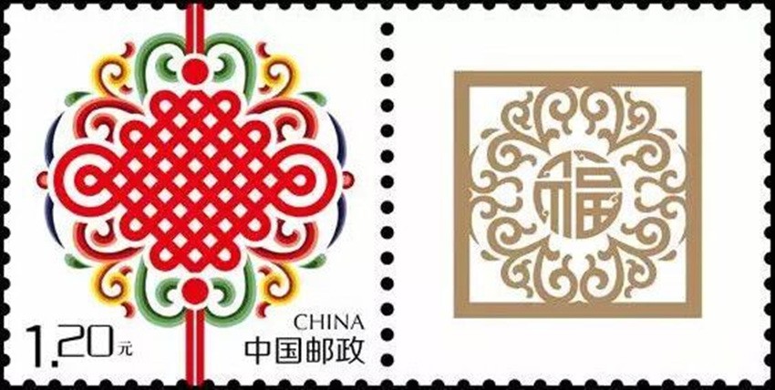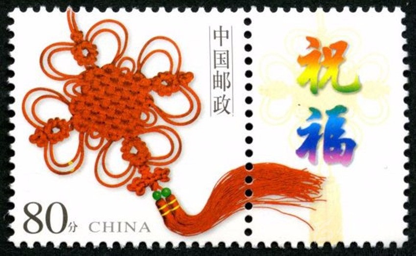 2002年5月10日,中國郵政發(fā)行《如意》個(gè)性化服務(wù)專用郵票一枚。主票圖案為如意柄端系著一個(gè)紅色“中國結(jié)”,附票有“祝福”二字; 2003年3月3日,中國郵政發(fā)行《同心結(jié)》個(gè)性化服務(wù)專用郵票一枚。主票圖案為盤長結(jié)4邊編織有心型繩結(jié)的同心結(jié),附票為“祝?!倍郑?006年9月25日,中國郵政發(fā)行《中華全國歸國華僑聯(lián)合會(huì)成立五十周年》紀(jì)念郵票一枚。圖案為阿拉伯?dāng)?shù)字“5”與中華全國歸國華僑聯(lián)合會(huì)圓形會(huì)徽組成數(shù)字“50”,象征全國僑聯(lián)五十周年,背景畫面為淡淡的粉紅色“中國結(jié)”。寓意歸國華僑與全國人民血肉相連,同心同德共同建設(shè)美好家園;2013年8月8日,中國郵政發(fā)行一枚《美好祝福》賀卡專用郵票,圖案為象征喜慶的紅色“中國結(jié)”;2014年9月20日,中國郵政發(fā)行《中國夢(mèng)(二)——民族振興》特種郵票,其中第四枚“民族團(tuán)結(jié)”,圖案中載歌載舞的各民族群眾上方有一個(gè)大紅的“中國結(jié)”,象征著各民族大團(tuán)結(jié)。