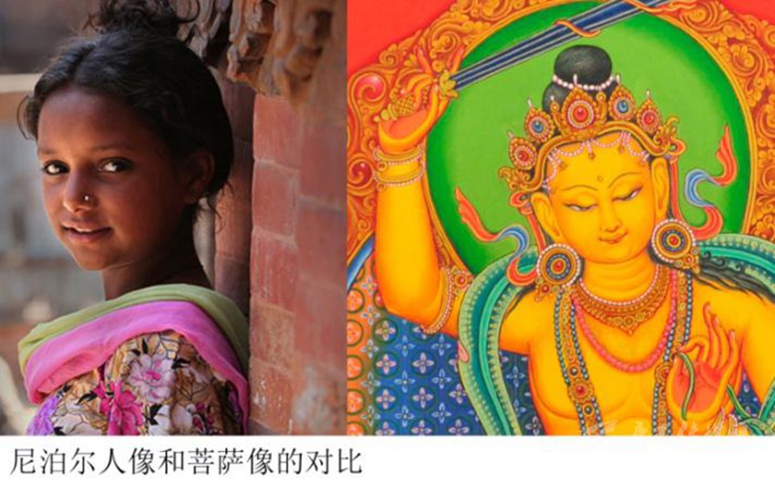 特別值得注意的是:之前佛教藝術(shù)的帕拉風(fēng)格繪畫中的臉型普遍是方正偏長的,而在尼瓦爾唐卡里,臉型普遍是方正偏短。偏短的方臉會讓五官顯得更加集中一點(diǎn),特別是眉額比較大、眼睛位置下移,這樣的感覺有點(diǎn)近似于嬰兒的面部比例。而眉骨、鼻骨高挺,又不似兒童,這樣的面部特征其實和尼國人的長相比較接近。也許是尼瓦爾人善于觀察、擅長描摹的天分,逐漸把本民族沉靜的性格與容貌,潛移默化地滲透進(jìn)了唐卡,產(chǎn)生了新的風(fēng)貌。