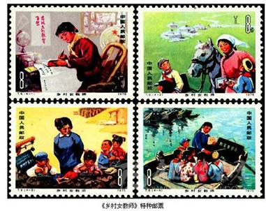 “燃燒自己,照亮別人”,是每一位教書人的精神寫照。在我國發(fā)行的郵票中就常常出現(xiàn)那些工作在基層的普通教師的忙碌身影。1959年9月25日,我國發(fā)行《人民公社》特種郵票,其中第5枚“學(xué)”,圖案是一位手執(zhí)課本神情專注地在課堂上教學(xué)的老師。這是我國郵票中首次出現(xiàn)教師形象。1966年5月10日,我國發(fā)行《服務(wù)行業(yè)中的婦女》特種郵票,其中第4枚“保育員”,是反映我國幼兒教師工作情景的一枚郵票。1976年2月20日,我國發(fā)行《勝利完成第四個五年計劃》紀(jì)念郵票,其中第13枚“牧區(qū)小學(xué)”,圖案是一位藏族女教師在寬敞明亮的教室里授課的情景,反映了新中國成立后,特別是第四個五年計劃期間,我國少數(shù)民族地區(qū)飛速發(fā)展的教育事業(yè)。1975年3月8日,我國發(fā)行《鄉(xiāng)村女教師》特種郵票,全套4枚,圖案分別是“認(rèn)真看書學(xué)習(xí)”“巡回教學(xué)”“開門辦學(xué)”和“水上小學(xué)”。全套郵票是工作在廣大農(nóng)村的中小學(xué)教育工作者在辦學(xué)條件艱苦的情況下仍然堅持認(rèn)真學(xué)習(xí)、勤奮工作、忠于黨的教育事業(yè)的真實(shí)寫照。