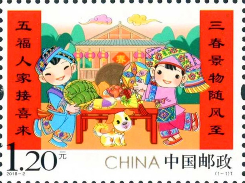 彰顯中華民族特有人情味的拜年郵票。拜年是我國春節(jié)的主要習(xí)俗,是中華民族優(yōu)秀的傳統(tǒng)文化,是人與人之間情感凝聚和維系的重要禮節(jié),具有獨特人情味。中國郵政從2015年至2019年連續(xù)發(fā)行了五組“拜年”系列郵票。2015年中國郵政發(fā)行的第一組《拜年》郵票,以其獨特的卡通風(fēng)格和濃郁的民俗特色,展現(xiàn)了人們過大年,拜大年時的喜悅場景。2018年正好是廣西壯族自治區(qū)成立六十周年,中國郵政發(fā)行 《拜年》郵票,畫面展現(xiàn)了壯家人過年時熱情好客的場景,桌子上擺放著柚子、香蕉、五色飯等當(dāng)?shù)靥厣褪澄?,打開的石榴籽粒飽滿、顆顆相抱,正如我國56個民族緊密團結(jié)在一起,形象貼切地體現(xiàn)了習(xí)近平總書記提出的“各民族要像石榴籽那樣緊緊抱在一起”的教導(dǎo)。 2019年春節(jié)恰逢與藏歷新年同一天,中國郵政發(fā)行的《拜年》郵票,郵票主圖畫面上“歡歡”與“喜喜”兩名藏族兒童,身穿藏族的盛裝,在布達拉宮前載歌載舞,整個畫面展現(xiàn)了藏族同胞歡快愉悅,喜慶新年的畫面,同時也表達了全國各族人民在黨的領(lǐng)導(dǎo)下,幸福生活,共筑中國夢的美好寓意。