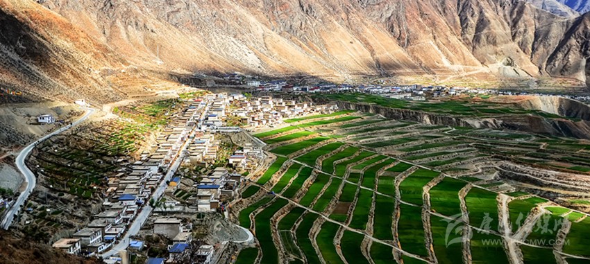 從得榮縣城出發(fā),途經(jīng)日龍鄉(xiāng),汽車順著盤山公路開始往下行駛,到半山腰處,司機(jī)輕輕踩一腳剎車熄火,在此作短暫休息。這時(shí),我打開車門俯瞰金沙江畔的因都壩,但見公路兩側(cè)一排排整齊的房屋像火柴盒一樣連綴在平坦壩子上,房屋下端,麥田梯次舒展,麥浪涌動,蔚為壯觀。