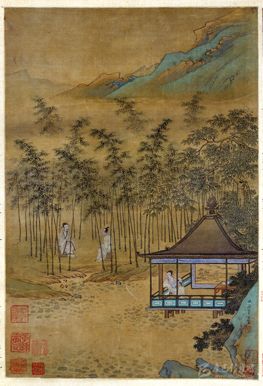 此圖意境極像唐代詩人王維的藍田山別墅。這里林木茂密,山澗淙淙,館舍、房屋散布其間,每到夏季,山風(fēng)習(xí)習(xí),涼爽怡人,王維和文友們在此度夏避暑,垂釣飲酒,談?wù)撛娢?,修身養(yǎng)性,過著悠閑自在的隱居生活。他在《竹里館》一詩里寫過自己的隱居快樂感受:“獨坐幽篁里,彈琴復(fù)長嘯。深林人不知,明月來相照?!比姼裾{(diào)幽靜閑遠,仿佛詩人的心境與自然的景致全部融為一體了。宋朝詩人楊萬里喜歡在皎潔的月光之下,清輝孤影,來到搖曳的竹林中,聽著夏夜里悅耳的蟲鳴,夜深氣清,盡管沒有涼風(fēng)送爽,但是悶熱暑氣頓時消失,于是他寫了一首《夏夜追涼》詩:“夜熱依然午熱同,開門小立月明中。竹深樹密蟲鳴處,時有微涼不是風(fēng)?!?/span>