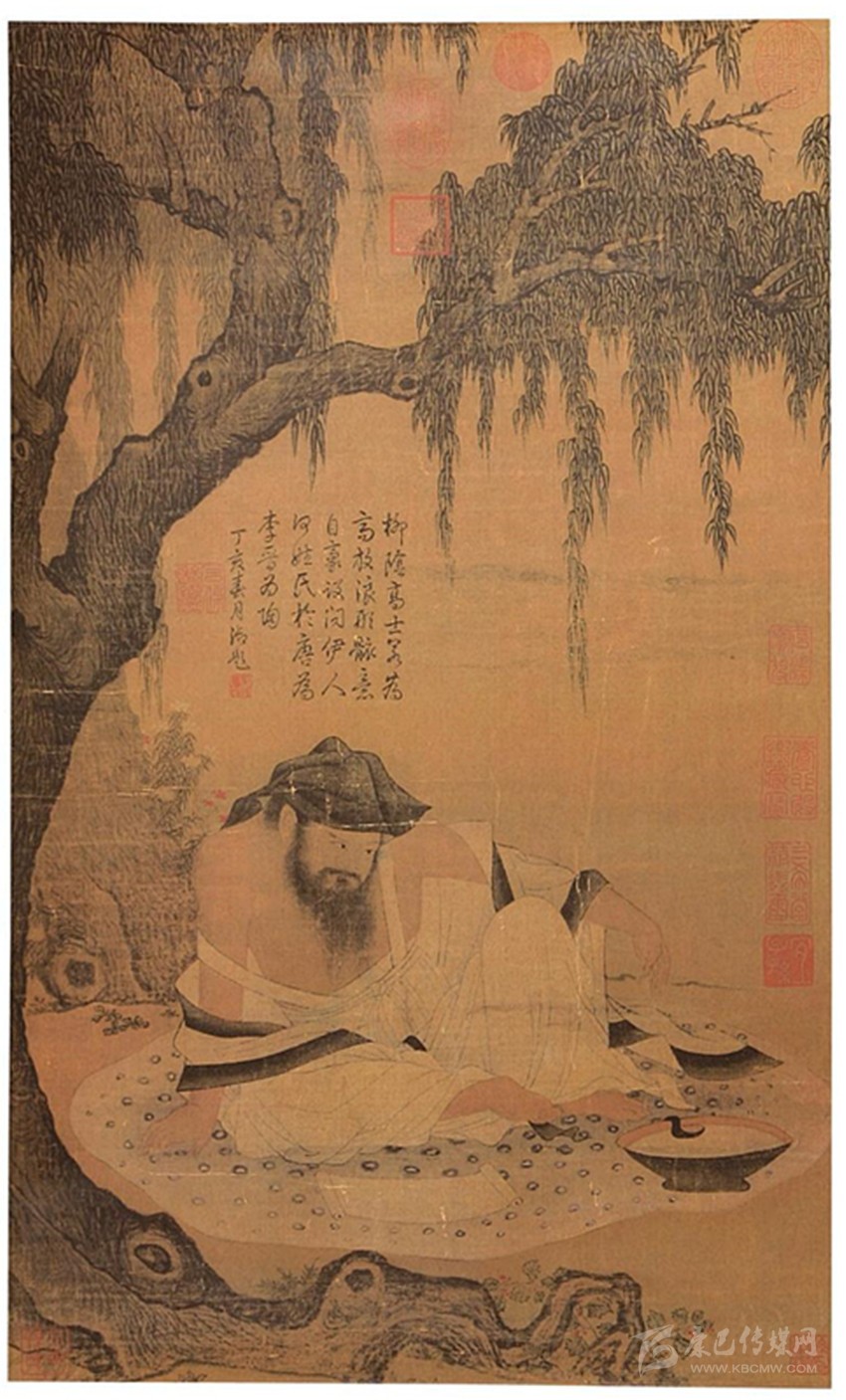 陶淵明曾說:“夏月虛閑,高臥北窗之下,清風(fēng)颯至,自謂羲皇上人?!币粋€高人隱士酒后高臥草廬窗下,悠閑自得乘涼的形象躍然紙上。唐代詩人李白非常向往陶淵明恬淡閑逸、與世無爭、天人合一的隱逸生活,寫詩曰:“陶令日日醉,不知五柳春。素琴本無弦,漉酒用葛巾。清風(fēng)北窗下,自謂羲皇人。何時到栗里,一見平生親?!北磉_了對陶淵明人品和理想的仰慕之情?,F(xiàn)藏于臺北故宮博物院的宋人《柳蔭高士圖》即是此意境。據(jù)《石渠寶笈》記載,此圖為素絹本著色畫,左方下有孫承澤印,右方下有北平孫氏印,左邊幅有棠村審定、蕉林二印。只知為宋人之作,相關(guān)的背景則無從查考。畫中為一棵古柳樹,樹干虬曲剛勁,枝葉繁茂。樹下一翁,美髯飄忽,袒胸露腹,頭戴葛巾,赤足席地而坐。坐前有一幅展開的手卷,酒樽滿盈,淺斟低酌。表面上看此翁雙目聚神,凝視手卷,實則已是眼餳耳熱,醺醺然不勝桮杓。清乾隆皇帝對《柳蔭高士圖》十分喜愛欣賞,在畫上御筆題詩云:“柳蔭高士若為高,放浪形骸意自豪。設(shè)問伊人何姓氏,于唐為李晉為陶?!鼻〉壅f,這位高士如是唐人就是李白,如是晉人便是陶淵明。但是從服飾和環(huán)境看,應(yīng)是五柳先生陶潛也。這幅圖所表現(xiàn)的就是“心靜自然涼”。