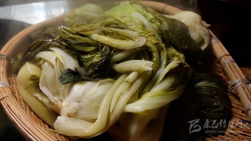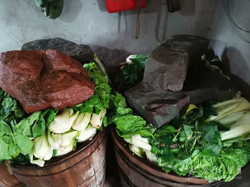 舊時化林坪家家都做鹽菜炒臘肉,為何李汝珍卻能在周家客棧的灶上烹調出這獨一份美味呢,原因就在這鹽白菜上面。據(jù)周家后人講述,李汝珍當年對鹽白菜的制作頗為在行,從選材、抹料到腌制、晾曬,每個步驟每一種材料都非常講究。她用作腌菜的食材需葉片長肉質厚的半包心本地大白菜,花椒粉則選用麻香味醇的漢源花椒,所需之水必須為本地山泉,她還特意在腌制時加入茴香苗、藿香葉等香料,在木桶或水缸上以巖石加壓更是匠心獨具。精心制作的鹽白菜,常常晾曬于客棧屋檐下或墻外各處,以其醇香之味吸引客人前來。久而久之,周家客棧鹽白菜的美味之名被背夫們帶到各地,“鹽白菜炒臘肉”也成了茶馬古道上的一道名菜。