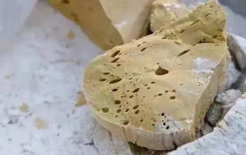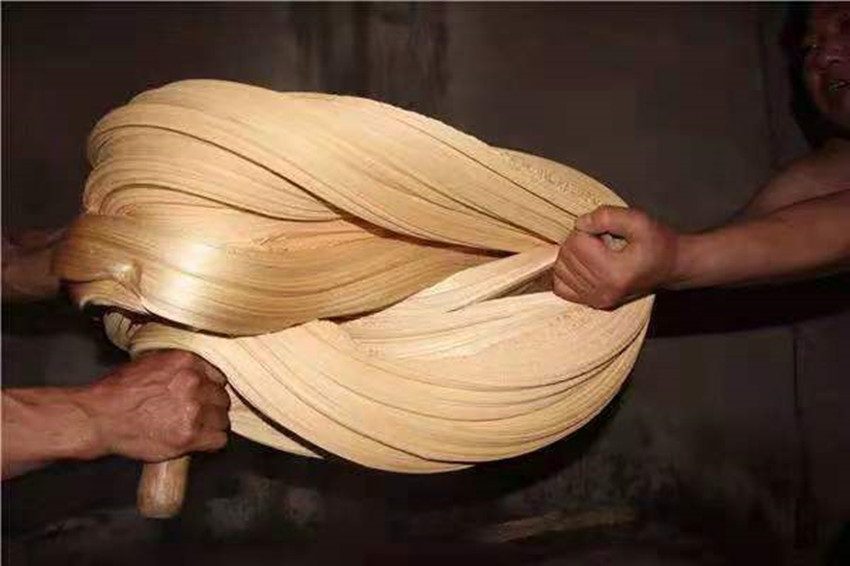 扯糖也是熬糖過程中十分關(guān)鍵的一個(gè)環(huán)節(jié)。剛出鍋的糖溫度可達(dá)兩三百度,徒手是不敢去觸碰的,扯糖需等到麻糖變得溫?zé)岵拍苓M(jìn)行,但又必須在它完全冷卻之前完成整個(gè)扯糖工序,否則等麻糖徹底冷卻就會(huì)變得僵硬無(wú)比。休息少頃,只見三叔熟練的用粘著面粉的手從盛放麻糖的簸箕中扯下三四斤左右的一團(tuán)麻糖,左手拿糖右手持杖(類似于搟面杖的木棍)作出扯糖的姿勢(shì),此時(shí)四叔拿著早已準(zhǔn)備好的沾了面粉的木棍將三叔的手中的麻糖攔腰別住,用力均勻的拉扯麻糖,三叔則在原地扎樁站穩(wěn),一手持杖作拉扯狀,一手微微扶住想要往下掉的糖尾,經(jīng)過幾次折疊和來(lái)回拉扯,麻糖變得均勻細(xì)長(zhǎng),兩人合力將扯好的麻糖平穩(wěn)的放在鋪有熟面粉的大簸箕中靜待冷卻。間隙二叔和父親又重復(fù)著扯糖的動(dòng)作,很快將一團(tuán)糖餅扯成糖帶。經(jīng)過拉扯后麻糖中間會(huì)形成很多的空洞,吃起來(lái)酥脆香甜。