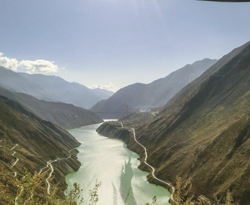 上嵐安的盤山路,在不停的彎折,每一個折又將路往上抬升一些,看著離大渡河越來越遠(yuǎn),應(yīng)該離嵐安近了。汽車在這條并不寬的路上行使,車窗外掠過的景色讓人有些意外。從來沒有從這個角度看過大渡河和沿河的景色,耀眼的陽光下,嵐安大橋橫跨大渡河,不遠(yuǎn)的地方是一個小村子,河水靜靜的流淌,平靜的河面如緞面般光滑。順著河流的方向,更遠(yuǎn)的地方就是雅康高速上的大渡河大橋,紅色的大橋在周圍藍(lán)的、綠的、灰的、白的顏色之中,很搶眼。這時,我們走過的路,也在身后像一條細(xì)細(xì)的白色帶子繞在山坡上。路旁高高的野草隨風(fēng)而動,黃色的莖須像極了豐收時的青稞。因?yàn)槭堑谝淮蝸?,每一眼看見的都是新鮮,上山的路,也就沒有想象中艱難。不過,聽說這條還算平坦的水泥路是新修的,之前的土路,又窄又陡,遇到會車都是很困難的。