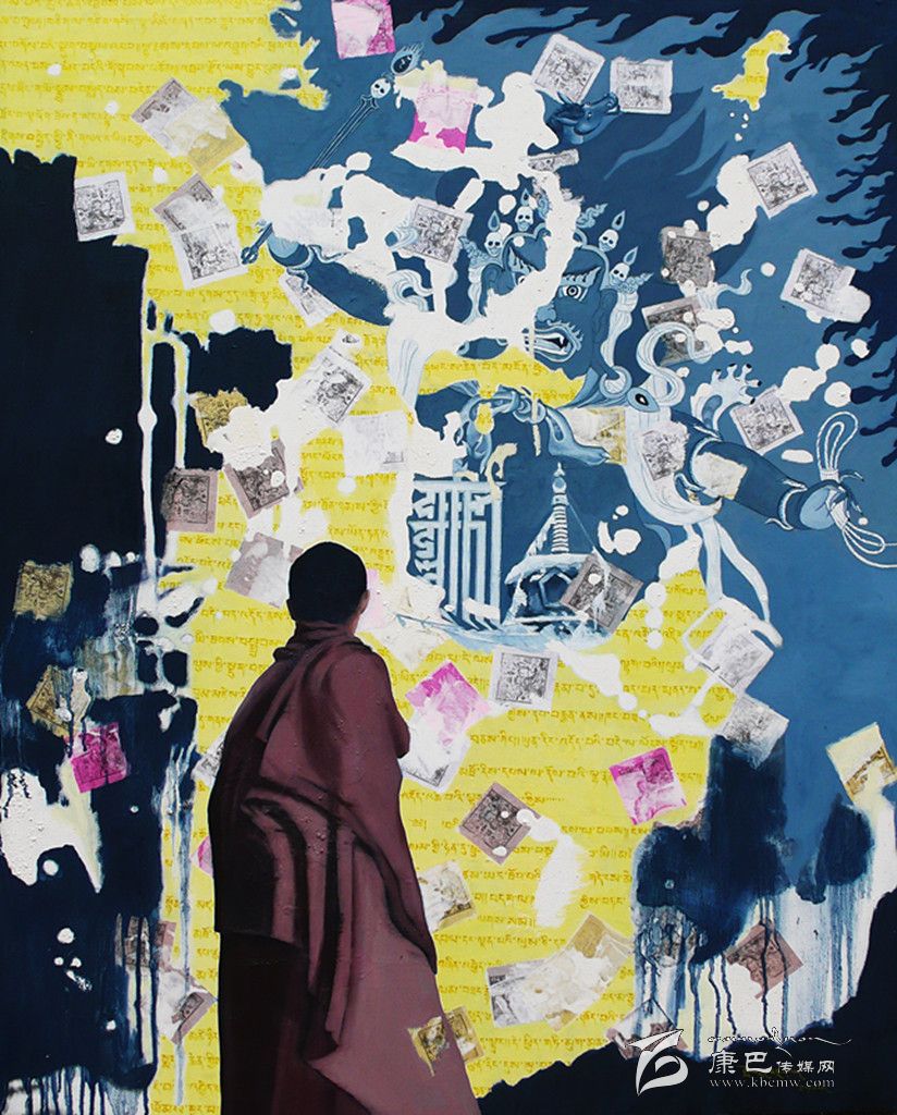 采用藏區(qū)題材做藝術(shù)的藝術(shù)家不在少數(shù),強調(diào)寫實、原汁原味是大部分藝術(shù)家的選擇,但生于康定的藝術(shù)家周韜卻有另一番更深入的認識。與美國印第安藝術(shù)家Brad kahlhamer一樣,他用更加強烈動態(tài)的視覺制造了一個魔幻世界,讓眾人熟悉的藏區(qū)元素在畫面上集中而豐富地跳躍起來,比如喇嘛、活佛、長辮子的藏族女人,甚至形狀怪異的骷髏!
