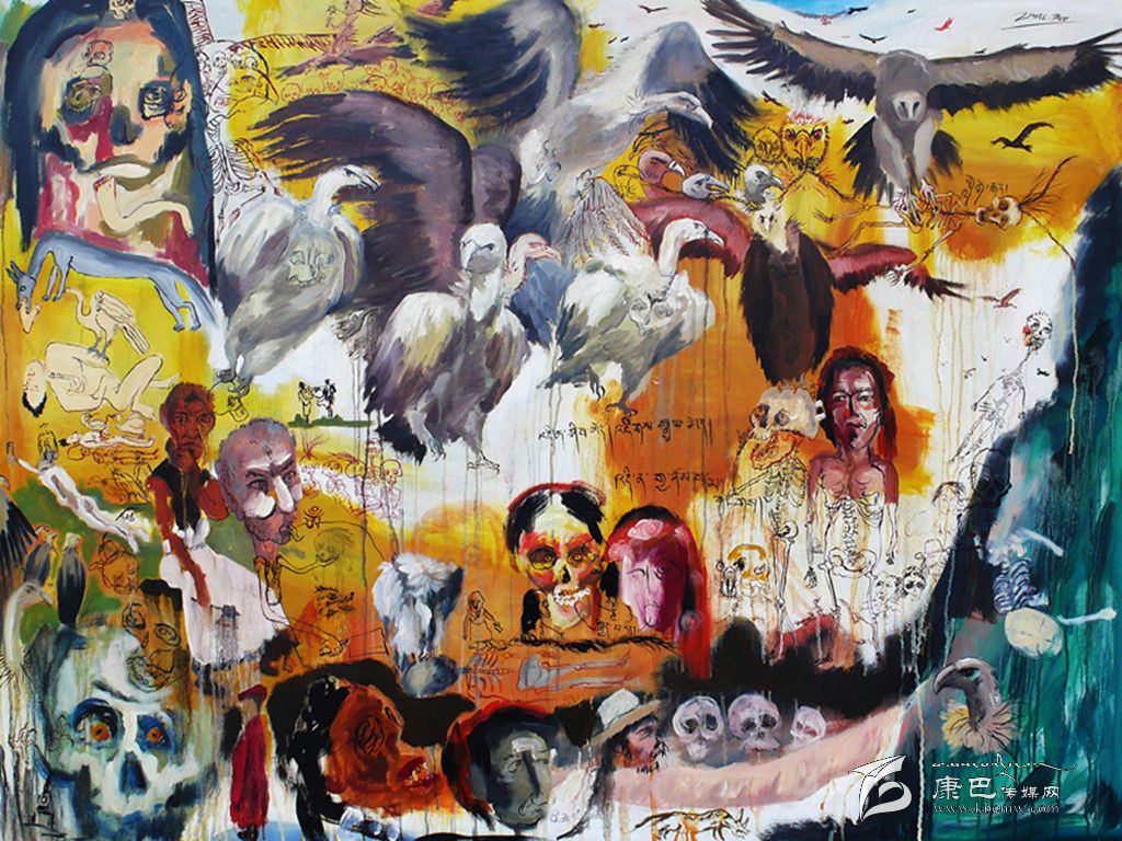 心態(tài)的豁達使周韜明確創(chuàng)作風格后,很自然地創(chuàng)作了以藏區(qū)文化為主題的油畫系列,比如《沐浴節(jié)》、《活佛》、《天葬》、《女孩和她的夢》。比如,在《天葬》里周韜大量使用各種狀態(tài)的骷髏,對此他的理解是“從有些人來看,它可能代表了某種邪惡,但是從民族文化和精神層面來理解,它是藏區(qū)文化的一部分,也是藏族人對生命的一種觀看方式,比如藏戲和法會中就有專門的骷髏舞。”