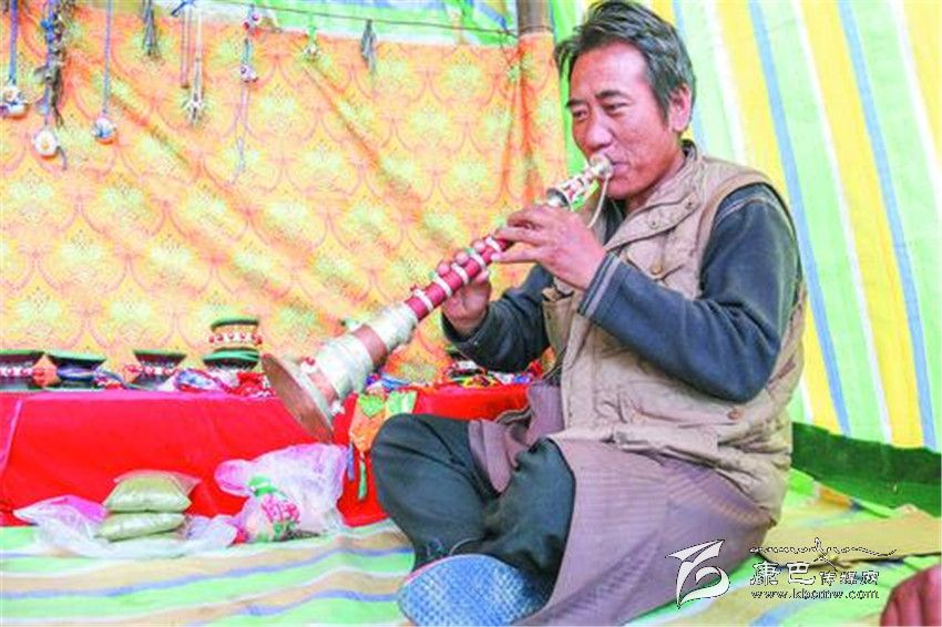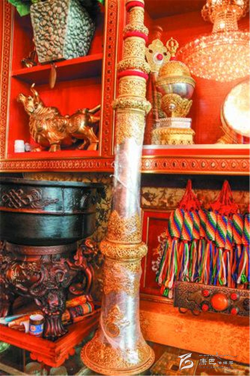 在河坡一代,像根秋丹貞、伍金這樣的手工藝人還有很多很多。其麥一家和根秋丹貞家一樣,也是主要制作佛器,在他的記憶里,爺爺、父親、叔叔、伯伯都是制作藝人,而自己家到底有多長的制作歷史,連他都說不清楚。51歲的扎西次仁這幾天有點忙,聽說噶陀寺最近要舉行法會,而以法器制作為主的他,早早的就在噶陀寺的臨時商點支起了“小賣部”,在這里叫賣自己家的精品法器,嘎烏、計數(shù)器、法號等等讓記者看得應接不暇。