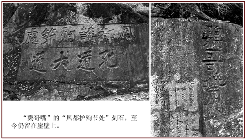 緊靠“鸚哥嘴”的,便是兩行從右至左、一上一下的橫書巨刻:“鳳都護(hù)殉節(jié)處”和“孔道大通”。它分明詔告世人,當(dāng)年那埸把康巴藏區(qū)鬧得個地覆天翻的大戲,便是從這里揭幕的。