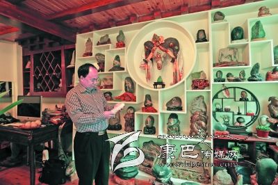 扎西澤仁(左)與州攝協(xié)主席郭昌平在奇石博物架前合影。