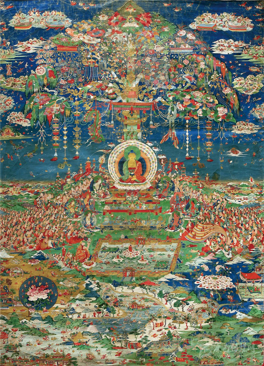 具有超越凡人的精微刻畫(huà)能力,也使得郎卡杰在面對(duì)畫(huà)布時(shí),有更廣大的空間來(lái)展示他的繪畫(huà)天賦。從存世的作品《無(wú)量光佛凈土》中,看得出郎卡杰喜歡將自己的“毫毛畫(huà)師”的能力發(fā)揮到極致。不管是花紋、瓔珞、還是人物,但凡是畫(huà)面上出現(xiàn)的物象,他都會(huì)以精致、繁密的形式出現(xiàn)。所以他的畫(huà)面世界里往往都是人山人海、琳瑯滿(mǎn)目;盈寸之間,容納萬(wàn)千;場(chǎng)面浩瀚、氣勢(shì)恢宏、不可思議!