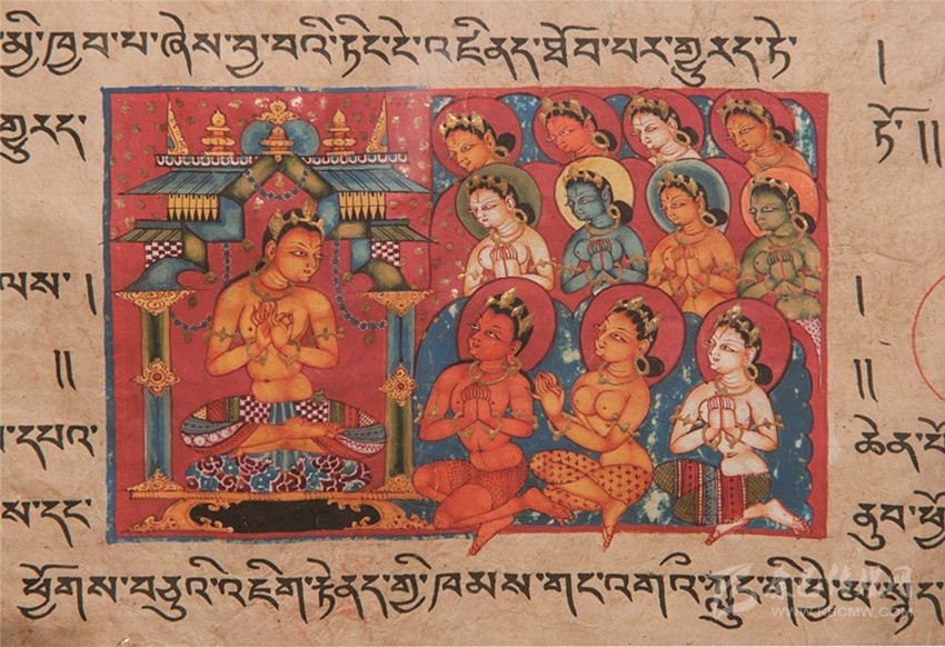 酥油燈點(diǎn)了一天又一年,千載之后墻壁熏得黝黑,曾經(jīng)絢爛無(wú)比的丹青圖畫(huà)就潛藏在這黝黑里,若隱若現(xiàn);一幀一鋪既是圣者傳奇,也是故國(guó)的見(jiàn)證。一頁(yè)帶插圖的經(jīng)書(shū)陳列在墻角柜子里,看守喇嘛捧與我們頂禮膜拜。經(jīng)書(shū)上畫(huà)著佛的前世(或某位菩薩)在廟堂上說(shuō)法,雙手結(jié)說(shuō)法印、上身著金釧瓔珞、下身著彩裙、跏趺坐于錦墊之上。他目光溫和注視著信眾,講到妙處有金色天花墜落。十一位華美的各色婦人蹲踞于前、雙手合十聆聽(tīng);前排三人抬頭看見(jiàn)空中落下的花雨,不禁歡喜贊嘆……