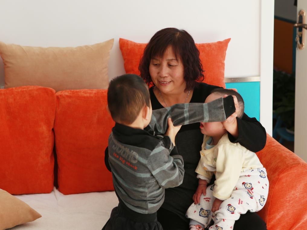 ??2017年11月3日,內(nèi)蒙古呼和浩特市兒童福利院里,“愛心媽媽”景鳳英抱著兩個(gè)孩子。新華社記者 王婧嬙 攝
