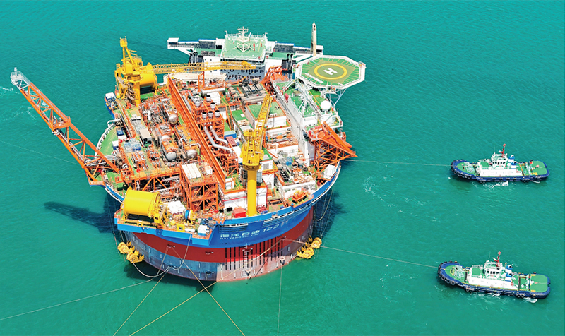 “??惶枴?,是亞洲首艘圓筒型浮式生產(chǎn)儲卸油裝置。該裝置集原油生產(chǎn)、存儲、外輸?shù)裙δ苡谝惑w,被網(wǎng)友們昵稱為“超級能源碗”,也是完全由我國自主設計建造的海上油氣加工廠。圖為2024年5月12日,“??惶枴睆闹袊S颓鄭u國際化高端裝備制造基地離港啟運。 人民圖片 張進剛/攝