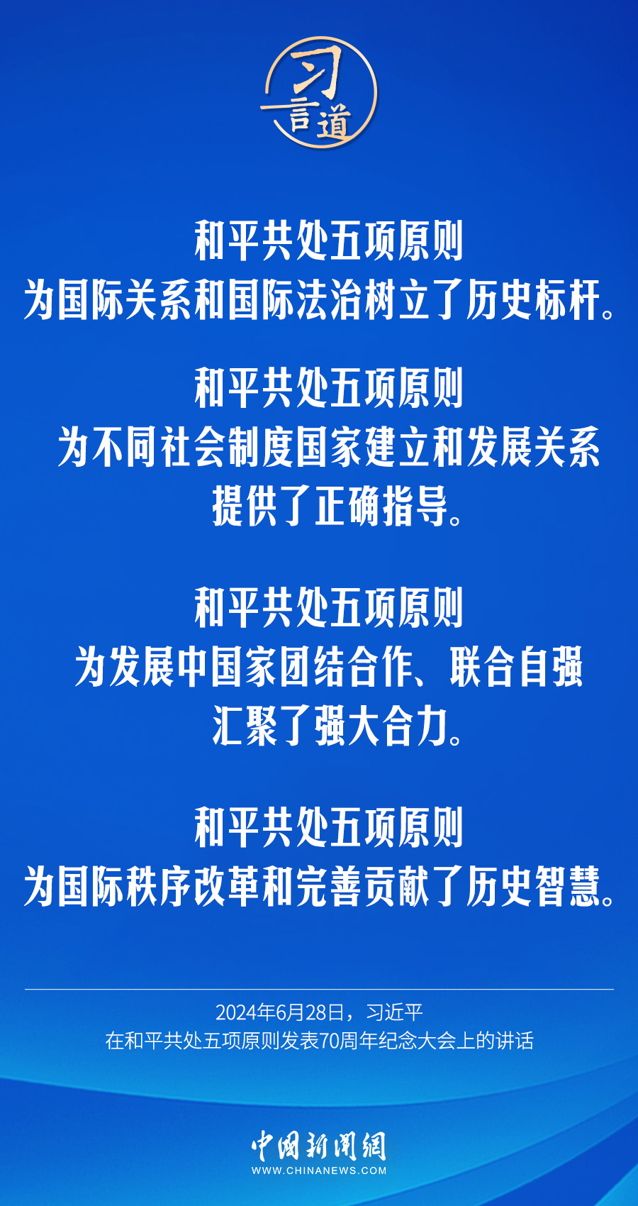 6月28日,國家主席習(xí)近平在北京人民大會(huì)堂出席和平共處五項(xiàng)原則發(fā)表70周年紀(jì)念大會(huì)并發(fā)表重要講話。習(xí)近平指出——