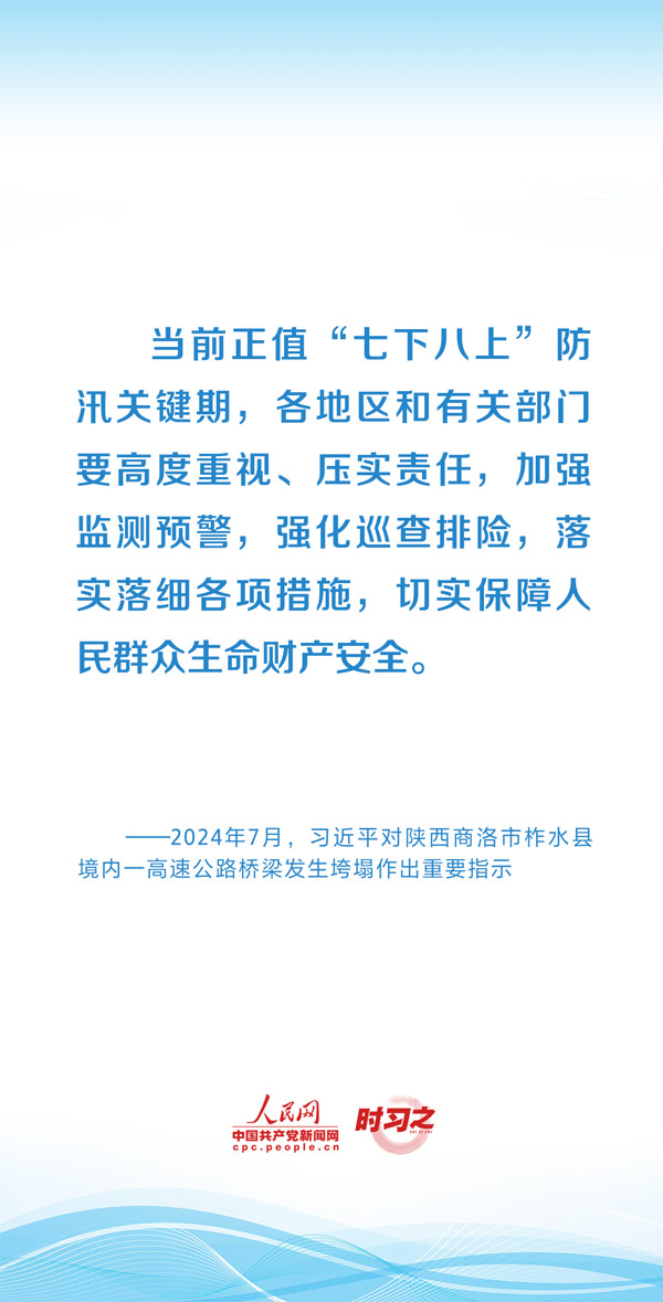 當(dāng)前防汛形勢(shì)嚴(yán)峻復(fù)雜,一些地方發(fā)生嚴(yán)重暴雨洪澇災(zāi)害。習(xí)近平總書記對(duì)此高度重視,強(qiáng)調(diào)當(dāng)前正值“七下八上”防汛關(guān)鍵期,各地區(qū)和有關(guān)部門要高度重視、壓實(shí)責(zé)任,加強(qiáng)監(jiān)測(cè)預(yù)警,強(qiáng)化巡查排險(xiǎn),落實(shí)落細(xì)各項(xiàng)措施,切實(shí)保障人民群眾生命財(cái)產(chǎn)安全。