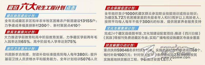 3月18日,四川省政府辦公廳印發(fā)《2015年藏區(qū)六大民生工程計劃總體工作方案》及藏區(qū)新居建設(shè)、教育發(fā)展振興、醫(yī)療衛(wèi)生提升、社會保障促進(jìn)、文化發(fā)展繁榮、扶貧解困行動等六個實施方案,預(yù)計各項民生資金總投入約52.66億元(含群眾投工投勞)。今年藏區(qū)“六大民生工程計劃”亮點紛呈,其中包括取消建設(shè)性項目州縣配套資金。