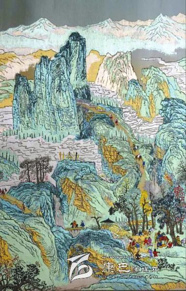 在蜀錦蜀繡展覽館中,由蜀錦大師馬德坤,蜀繡大師鄔學(xué)強共同創(chuàng)作大型錦繡作品《南方絲路圖》,吸引不少游客駐足。該作品天空部分的藍色由深及淺,并逐步過渡到表現(xiàn)地面的泥金色。同時,利用絲織品的透光性,使遠山和近景形成強烈對比,大大地增強了畫面的縱深感。