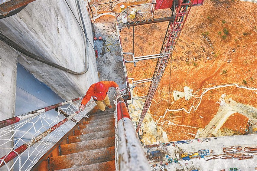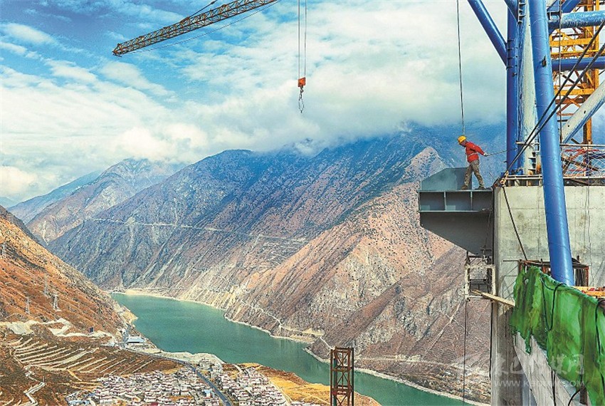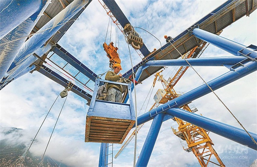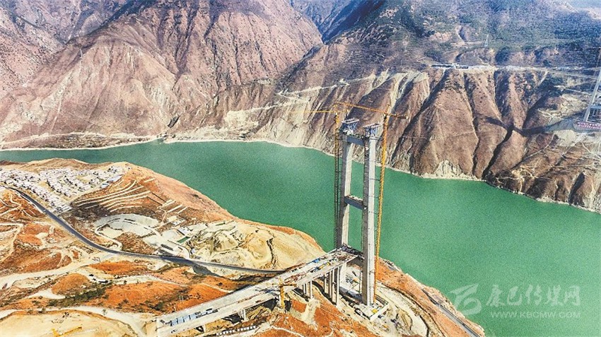 瀘定大渡河興康特大橋是雅康高速公路的重點控制性工程之一,是一座建在高海拔、高地震烈度帶上的超大跨徑鋼桁梁懸索橋,采用鋼混疊合橋道系,造價超過10億元,因建設技術難度大被譽為“川藏第一橋”。兩岸主墩索塔高188米,塔頂至河面垂直高差364米,橋橫跨大渡河,但在河中沒有橋墩,采取的是懸索橋設計,在兩岸修建兩塔、兩錨,作為支撐和受力,橋面以懸索拉伸。未來,大橋?qū)⒁?/span>1100米的超長跨徑連通大渡河兩岸,變天塹為通途。 (何海洋 攝影報道)