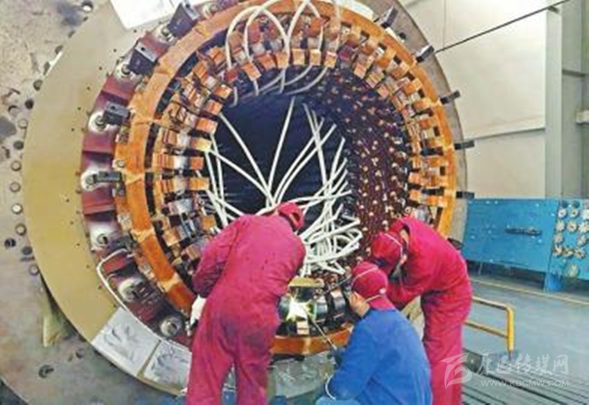 2月22日,在東方電機(jī)發(fā)電機(jī)分廠,工人們正對(duì)中煤五彩灣4號(hào)機(jī)定子進(jìn)行高工位電路焊接。 東方電氣集團(tuán)東方電機(jī)有限公司供圖