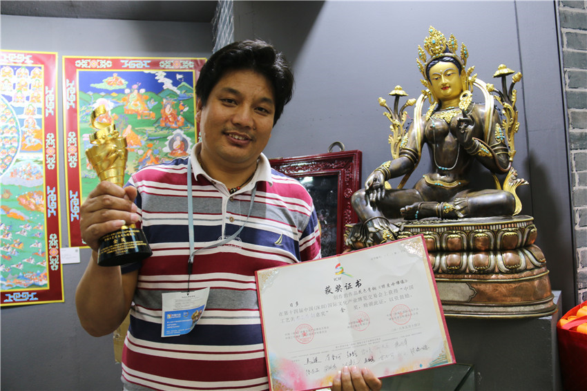 本網(wǎng)訊(記者 宋志勇 文/圖)5月14日,歷時(shí)5天的2018年第十四屆中國(guó)(深圳)國(guó)際文化產(chǎn)業(yè)博覽交易會(huì)(以下簡(jiǎn)稱深圳文博會(huì))圓滿落幕。我州憑借花色青銅《綠度母佛像》作品摘得“中國(guó)工藝美術(shù)文化創(chuàng)意獎(jiǎng)”金獎(jiǎng),成為本屆文博會(huì)大眾關(guān)注的焦點(diǎn)。
