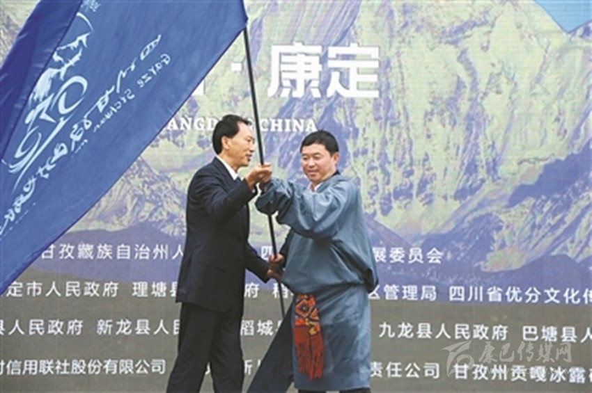 州委副書(shū)記、州政府州長(zhǎng)肖友才向下一屆四川甘孜山地旅游節(jié)舉辦地丹巴縣交接會(huì)旗。 余秋林 記者 肖宵 攝