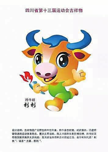 吉祥物是廣元野生羚牛娃形象。羚牛姿態(tài)挺拔,威武雄壯,凸顯矯健快速的運(yùn)動(dòng)體育特點(diǎn),展現(xiàn)無畏艱險(xiǎn)、向上沖勁和體育拼搏精神。羚牛娃面帶微笑,敞開胸懷大步向前,充滿好客熱情和吉祥祝福之情。名字利利代表“利州”,諧音“力量、勝利”。
