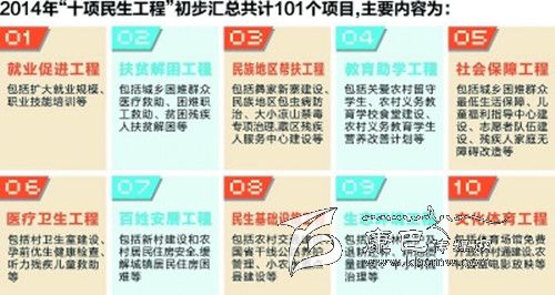 在征求各級(jí)部門(mén)、基層群眾意見(jiàn)的基礎(chǔ)上,今年“十項(xiàng)民生工程”已初步匯總101個(gè)項(xiàng)目,主要有:就業(yè)促進(jìn)工程,包括擴(kuò)大就業(yè)規(guī)模、職業(yè)技能培訓(xùn)等;扶貧解困工程,包括城鄉(xiāng)困難群眾醫(yī)療救助、困難職工救助等;民族地區(qū)幫扶工程,包括大小涼山禁毒專項(xiàng)治理、藏區(qū)殘疾人服務(wù)中心建設(shè)等;教育助學(xué)工程,包括農(nóng)村義務(wù)教育學(xué)校食堂建設(shè)等;社會(huì)保障工程,包括志愿者隊(duì)伍建設(shè)、殘疾人家庭無(wú)障礙改造等;醫(yī)療衛(wèi)生工程,包括孕前優(yōu)生健康檢查、聽(tīng)力殘疾兒童救助等;百姓安居工程,包括農(nóng)村居民住房安全、緩解城鎮(zhèn)居民住房困難等;民生基礎(chǔ)設(shè)施工程,包括國(guó)省干線公路養(yǎng)護(hù)管理等;生態(tài)環(huán)境工程,包括耕地質(zhì)量建設(shè)、中小河流治理等;文化體育工程,包括體育場(chǎng)館免費(fèi)開(kāi)放等。