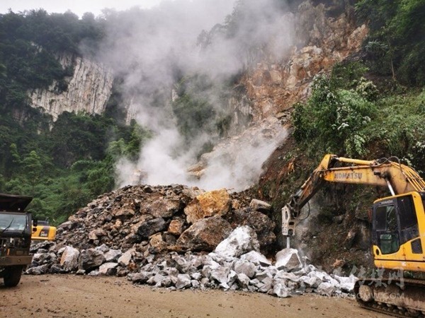 周宗海說(shuō),為搶通中斷路段,珙縣自然資源和規(guī)劃局于18日中午一點(diǎn)開始,組織機(jī)具10余臺(tái) ,人員20余人進(jìn)行連續(xù)加班作業(yè),對(duì)垮塌巖體進(jìn)行爆破、清運(yùn),清理碎石約15000噸,于19日晚上十點(diǎn)搶通了該路段。