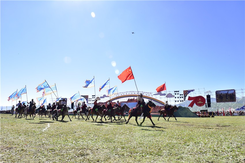 “四山旗似晴霞卷,萬馬蹄如驟雨來”。上午十點,石渠縣四個片區(qū)組成的四個馬隊方陣高舉印有“世界最美濕地”“千年唐蕃古道”“石刻藝術王國”“吉祥太陽部落”字樣的四色彩旗,眾星拱月般簇擁著中華人民共和國國旗和慶祝中華人民共和國成立70周年活動標識,策馬入場,拉開了2019中國·石渠—太陽部落帳篷狂歡節(jié)的帷幕。