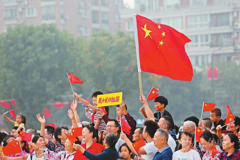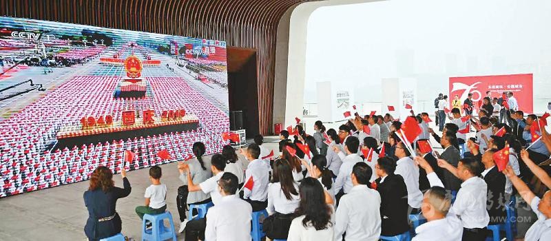 上午10時(shí),慶祝中華人民共和國成立70周年大會(huì)開始。通過電視信號(hào),大會(huì)盛況傳遞至每個(gè)現(xiàn)場?!芭c祖國母親同在,祝福祖國繁榮昌盛。”這是大家共同的心聲。□本報(bào)記者 林凌 何勤華 程文雯 徐中成 陳碧紅 文莎
