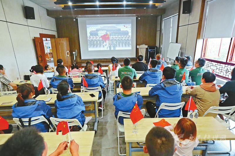 10月1日上午,雅安市蘆山縣龍門鎮(zhèn)上百名干部群眾聚集到龍門山莊,共同觀看直播。