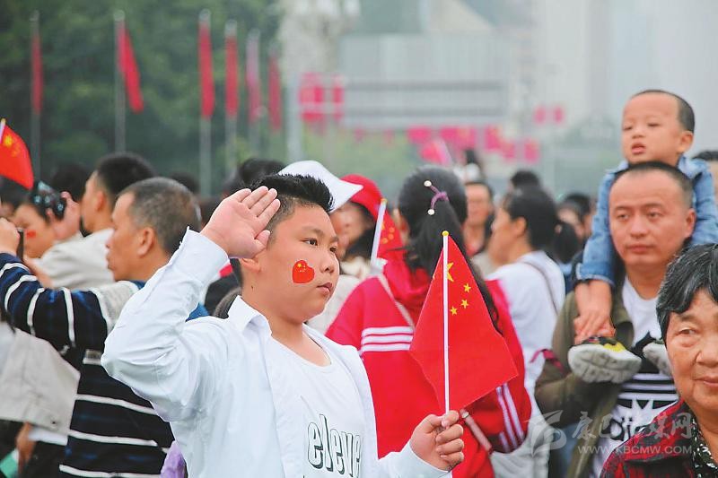 在廣元,雖然天空飄著小雨,但上百名黨員干部和市民自發(fā)聚集在市政府廣場。雄壯的國歌聲中,目送五星紅旗冉冉升起后,現(xiàn)場爆發(fā)出熱烈的歡呼聲。升旗儀式結(jié)束后,廣元市委組織部年輕干部趙志浩請同事為自己和父親拍了3張合影。作為當(dāng)?shù)匾M(jìn)的人才,他第一次在廣元參加國慶升旗活動(dòng),“見證共和國70華誕,也激勵(lì)我為廣元發(fā)展貢獻(xiàn)力量。”