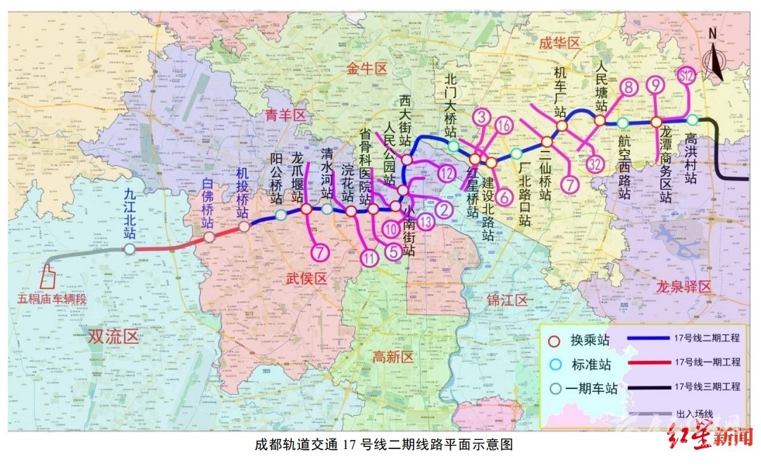 紅星新聞記者了解到,17號線一期工程已于2017年1月開工建設(shè),計(jì)劃于2020年12月底建成投入試運(yùn)營。本次環(huán)評公示的17號線二期工程位于成都市雙流區(qū)、武侯區(qū)、青羊區(qū)、金牛區(qū)和成華區(qū),工程起于一期工程機(jī)投橋站(不含),止于高洪片區(qū)的高洪村站(含),線路自西向東沿永康路-晉陽路-龍騰東路-大石西路-小南街-北較場西路-成華街-張家巷-建設(shè)北路-二仙橋北路-航天路敷設(shè)。線路長約24.8km,均為地下線路,共設(shè)置地下車站18座,其中有換乘站12座。