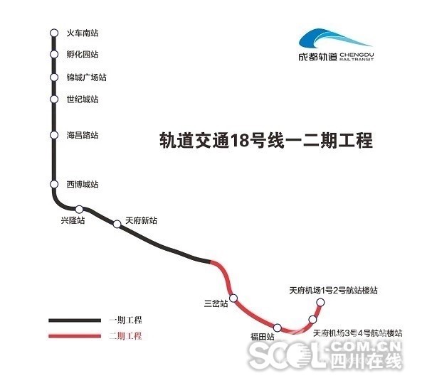 服務(wù)于成都市區(qū)與成都天府國際機(jī)場之間,北起火車南站,南至天府新機(jī)場,線路全長66.8Km,共設(shè)12座車站。(圖據(jù)成都軌道建設(shè)公司)