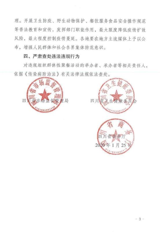 四川新聞網(wǎng)成都1月25日訊(記者 李丹)1月25日,四川省市場監(jiān)督管理局、四川省衛(wèi)生健康委員會、四川省商務(wù)廳3部門聯(lián)合發(fā)布緊急通知,近期新型冠狀病毒感染的肺炎疫情防控形勢嚴(yán)峻,為認(rèn)真貫徹落實省委省政府關(guān)于啟動重大突發(fā)公共衛(wèi)生事件一級響應(yīng)措施暨應(yīng)對新型冠狀病毒感染的肺炎疫情決策部署,有效保證廣大群眾生命安全,根據(jù)《傳染病防治法》等有關(guān)法律法規(guī),禁止任何餐飲單位和個人舉辦任何形式的群體性聚餐活動,已經(jīng)訂餐的應(yīng)盡快取消或延期舉辦。