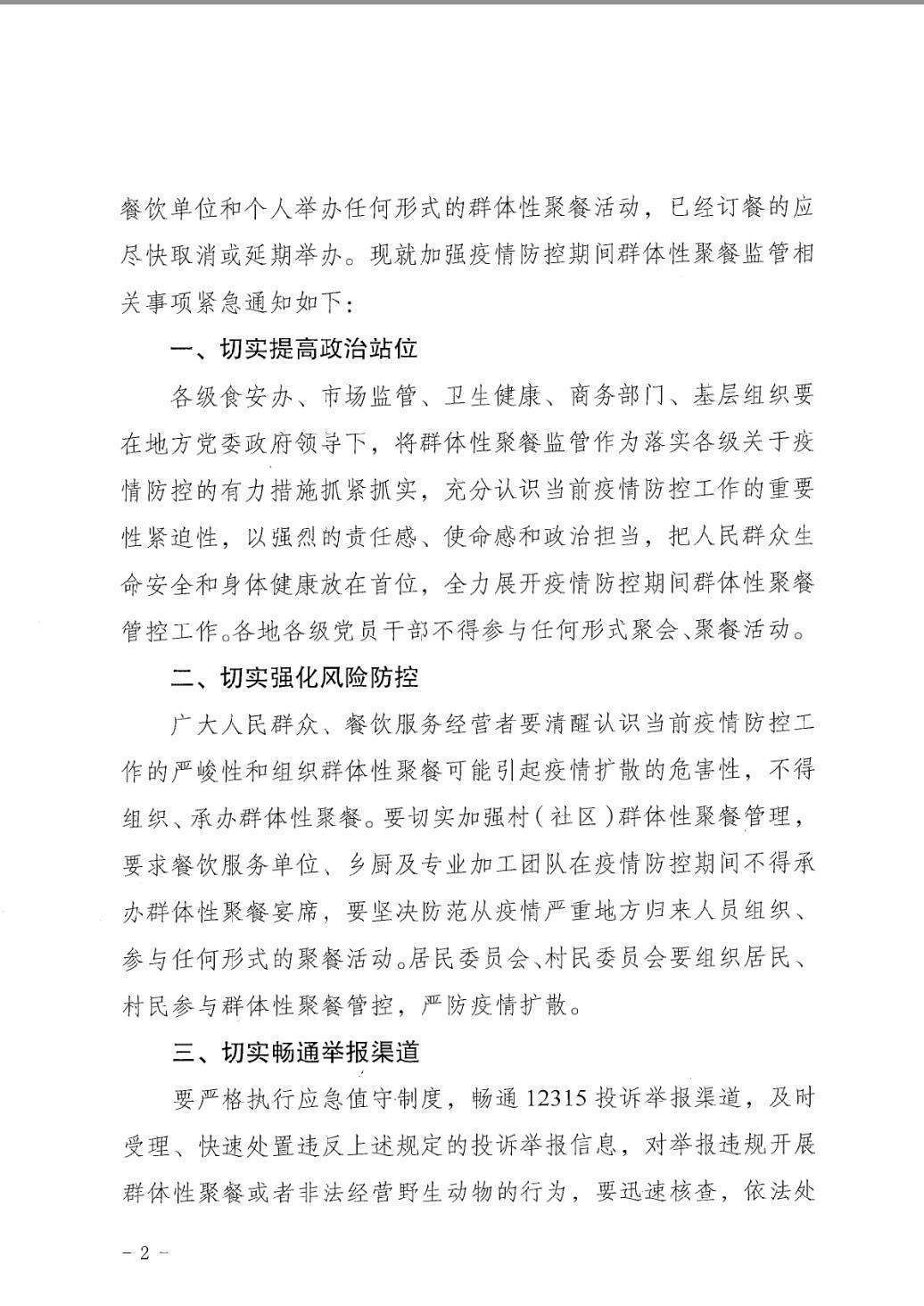 各級食安辦、市場監(jiān)管、衛(wèi)生健康、商務(wù)部門、基層組織要在地方黨委政府領(lǐng)導(dǎo)下,將群體性聚餐監(jiān)管作為落實各級關(guān)于疫情防控的有力措施抓緊抓實,充分認(rèn)識當(dāng)前疫情防控工作的重要性緊迫性,以強烈的責(zé)任感、使命感和政治擔(dān)當(dāng),把人民群眾生命安全和身體健康放在首位,全力展開疫情防控期間群體性聚餐管控工作。各地各級黨員干部不得參與任何形式聚會、聚餐活動。